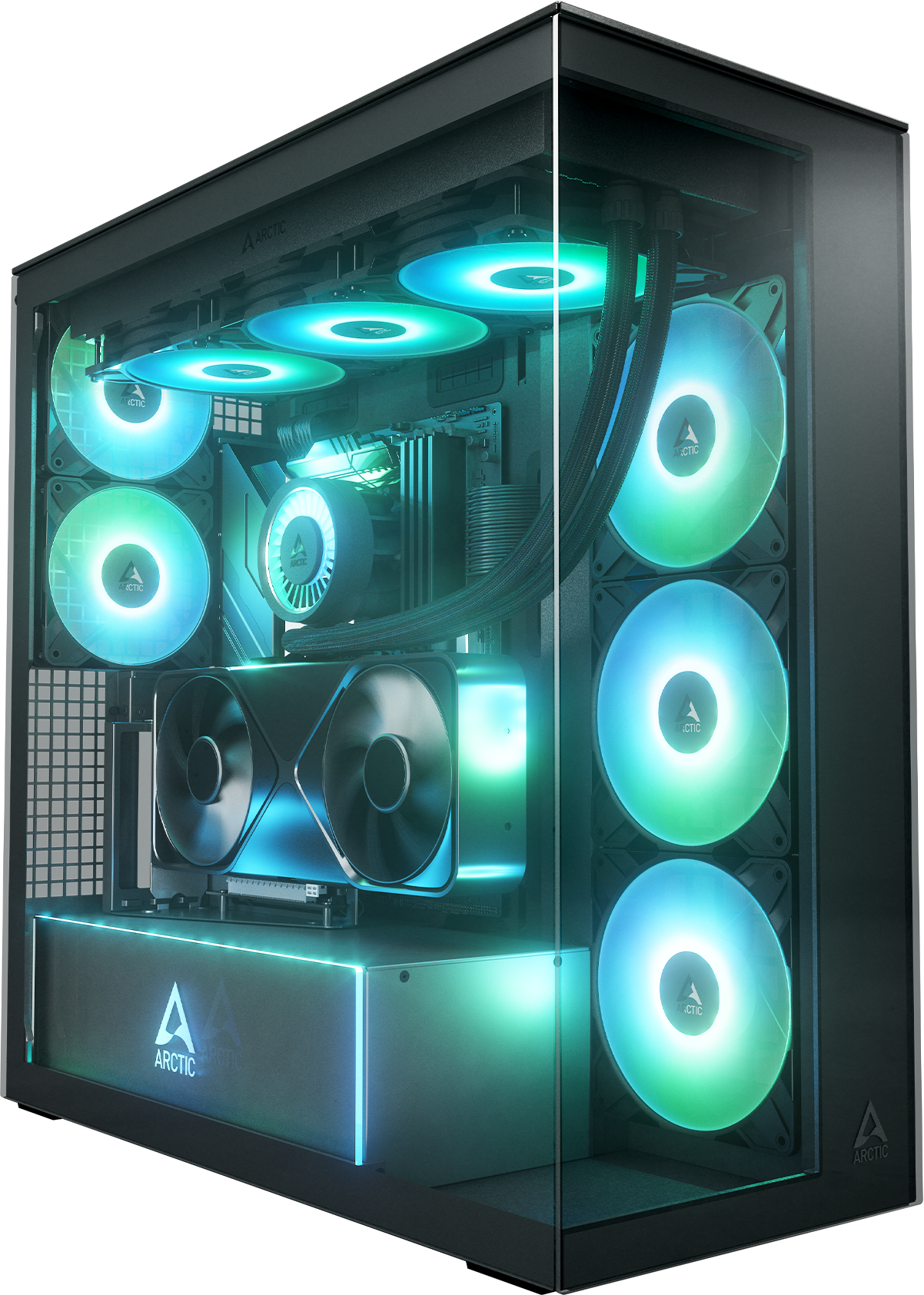 El Xtender VG ofrece una compatibilidad impresionante con hardware de última generación, admitiendo placas base de formato Extended ATX y tarjetas gráficas de gran tamaño, incluso con la posibilidad de instalarlas en orientación vertical. Esto proporciona una flexibilidad considerable para crear configuraciones personalizadas y potentes. Para maximizar la refrigeración, el gabinete está optimizado para sistemas de refrigeración líquida, brindando espacio para radiadores de hasta 420 mm tanto en la parte superior como lateral. Además, incluye ventiladores ARCTIC P-Series Pro A-RGB, que combinan un rendimiento excepcional con la capacidad de programar y personalizar sus efectos de iluminación.