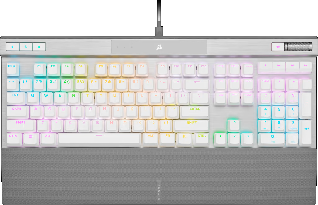 El K70 RGB PRO incluye características diseñadas para optimizar la experiencia competitiva, como un interruptor de torneo que desactiva la retroiluminación dinámica y evita la activación accidental de macros. Además, incorpora teclas multimedia dedicadas y una rueda de volumen para un control rápido y preciso del audio, sin interrumpir la partida. La conectividad USB Type-C trenzado y extraíble facilita la portabilidad y la conexión a diversos dispositivos.