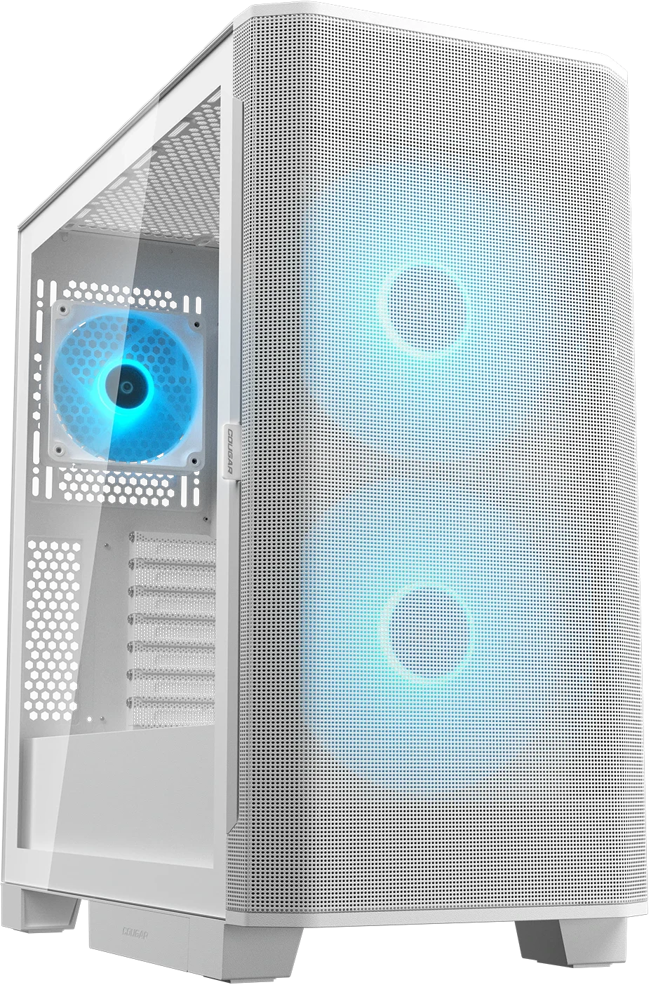 El Cougar Airface FLO RGB en blanco ofrece una solución de enfriamiento de alto rendimiento combinada con un diseño estéticamente atractivo. Este gabinete está diseñado para usuarios que priorizan un sistema de refrigeración eficiente y un aspecto moderno, permitiendo una visualización clara de los componentes internos gracias a su panel lateral de vidrio templado. El diseño incorpora una estructura frontal de malla que optimiza el flujo de aire, crucial para disipar el calor generado por componentes de alto rendimiento.