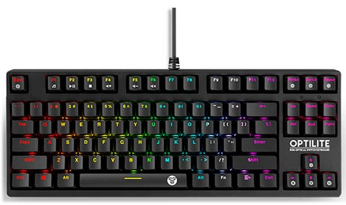 El Fantech MK872 Optilite RGB es un teclado mecánico diseñado para ofrecer un rendimiento excepcional a jugadores y usuarios que buscan un control preciso y duradero. Con un formato compacto de 80% (Tenkeyless), este teclado combina una experiencia táctil superior con una respuesta rápida, impulsada por sus switches ópticos mecánicos. Estos switches están diseñados para proporcionar una velocidad de respuesta superior y están certificados para soportar hasta 50 millones de pulsaciones, garantizando una larga vida útil.