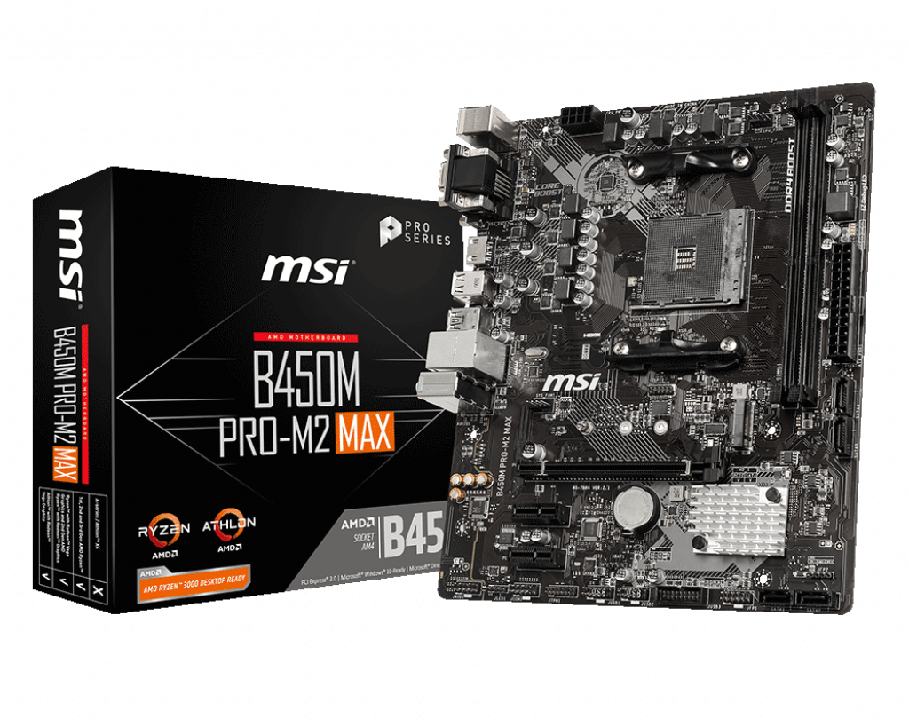 La MSI B450M PRO-M2 MAX es una placa madre de formato Micro ATX diseñada para configuraciones informáticas basadas en procesadores AMD Ryzen de primera, segunda y tercera generación, así como con los procesadores AMD Athlon con gráficos Radeon Vega integrados, utilizando el socket AM4. Esta placa soporta memorias DDR4 de alta velocidad que pueden alcanzar velocidades de hasta 3466+ MHz, cuatro puertos SATA 6 Gb/s para dispositivos de almacenamiento tradicionales y una ranura M.2 PCIe Gen3 x4 para SSDs NVMe, soportando configuraciones RAID 0, 1 y 10. También ofrece conectividad USB 3.1 Gen1 y USB 2.0, salidas de video VGA, DVI-D y HDMI 1.4, y audio de alta definición 7.1 canales con un códec Realtek ALC887.
