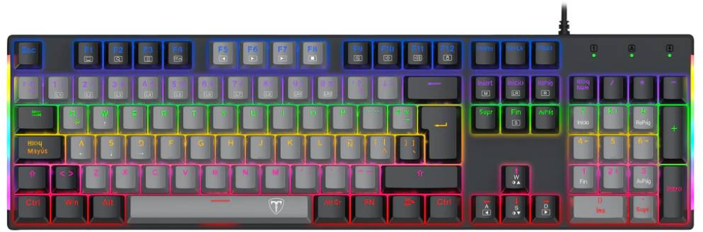 El teclado mecánico T-Dagger Naxos (modelo T-TGK310GB) es una opción diseñada para jugadores y usuarios que valoran una experiencia de escritura precisa y una estética atractiva. Este teclado full size ofrece un diseño robusto y funcional que se enfoca en mejorar la inmersión durante las sesiones de juego. Incorpora retroiluminación RGB con una variedad de colores predefinidos, permitiendo una visualización clara y atractiva incluso en condiciones de poca luz.